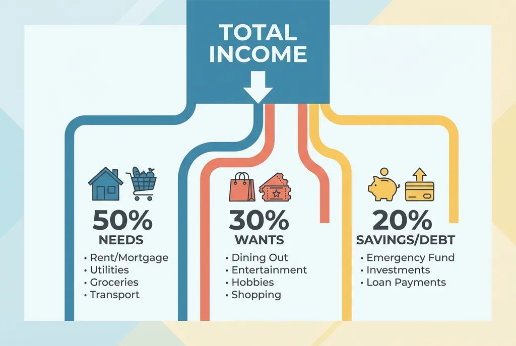 The 50/30/20 rule divides your after-tax income into three buckets: 50% for needs (rent, utilities, groceries, insurance), 30% for wants (dining out, entertainment, hobbies), and 20% for savings and debt repayment. It's a framework, not a strict requirement.